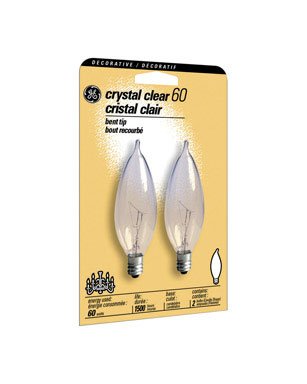 "G.E." DECORATIVE BENT TIP LIGHT BULB *Candelabra base *4-1/8" M.O.L. *Avg. life 1500 hrs. *Clear *60CAC, 60 Watts, 650 Lumens *Card/2