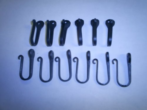 Our hand wrought iron pieces are made for us in the Lancaster County, PA. Amish Community. With classic style and functional design, these versatile pieces blend into most decorating schemes. This is solid iron--not wire. These pieces are finished in satin black and work well in any room.This listing is for 12 (one dozen) of our large Nail hooks. These measure almost 2 inches in height and are great for hanging small objects. Each is handmade-there is some variation from hook to hook. Use your imagination- the uses are endless. These have one mounting hole. We do not include mounting hardware because it is determined by the surface you are attaching these items to. It will be anything from small nails, screws, or drywall and plaster anchors and is readily available at home centers, hardware stores--even grocery stores!!.